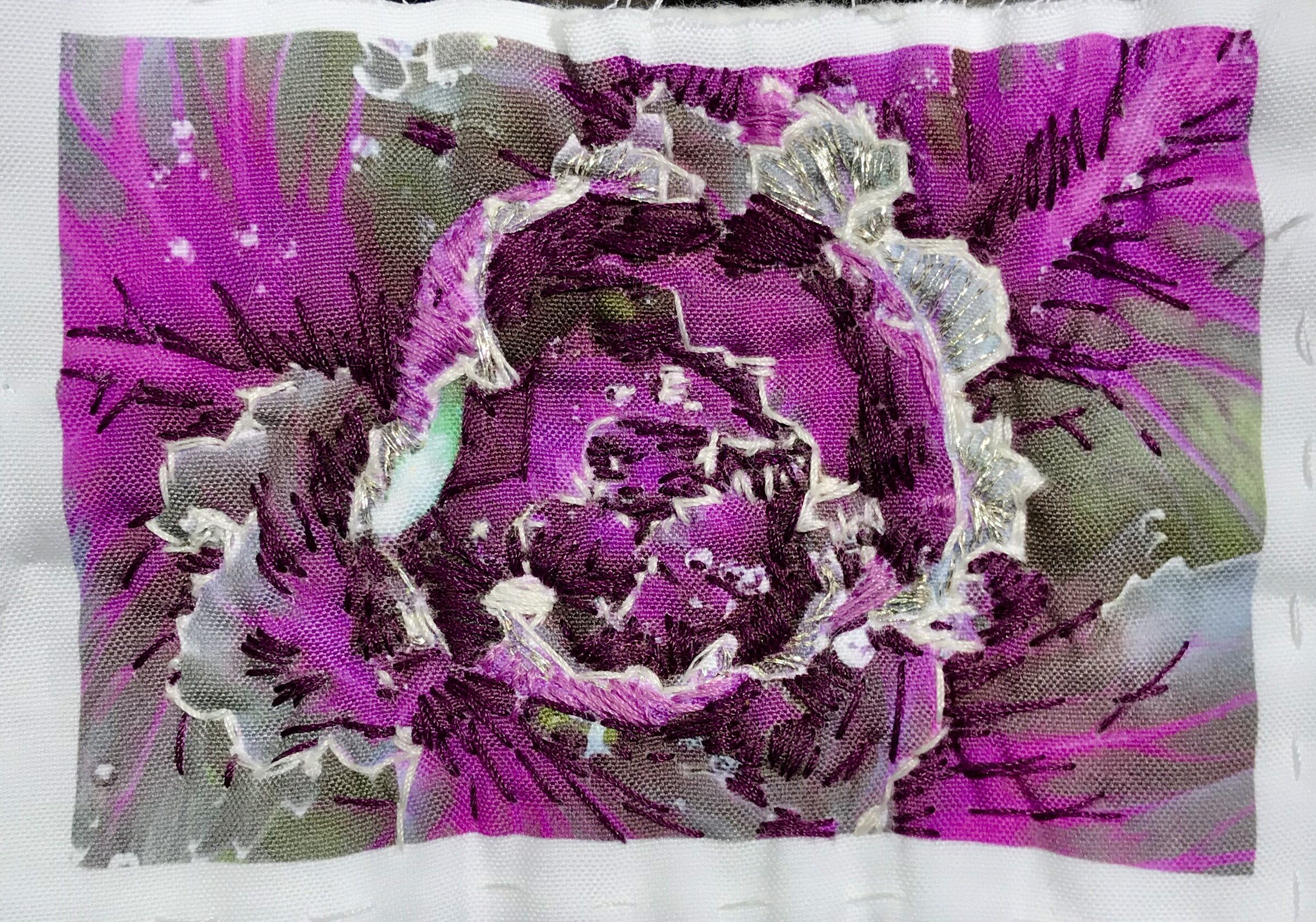 My photo printed onto upcycled cotton and hand-stitched for many hours.